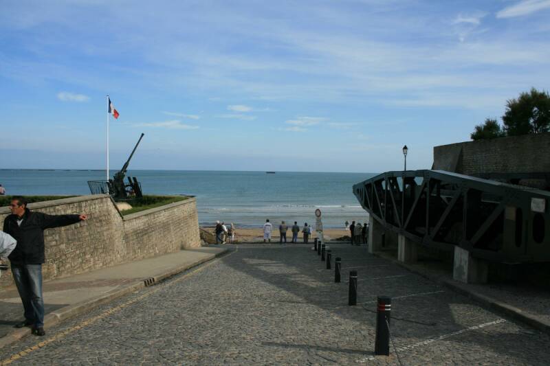 Arromanches is onze eerste halte vandaag. We nemen een kijkje in het Landingsmuseum en de omgeving. De resterende containers van de artificiële haven liggen nog voor het strand.