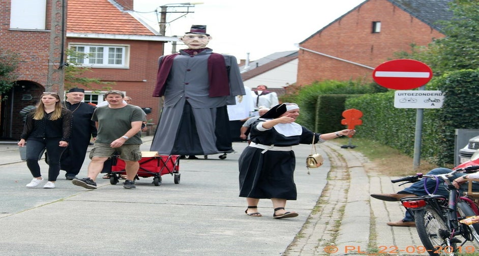 Voor de stoet kan vertrekken worden de Reuzen opgebouwd. De folkloregroepen en paardenkoetsen maken zich klaar.