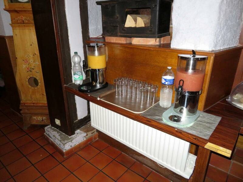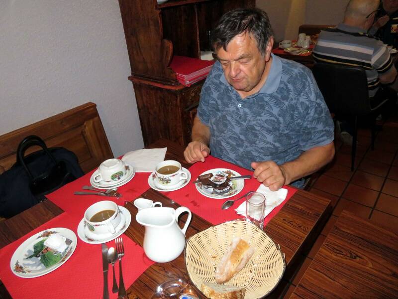 Laatste ontbijt in Hotel La Couronne. Weer 5 potjes choco P...?